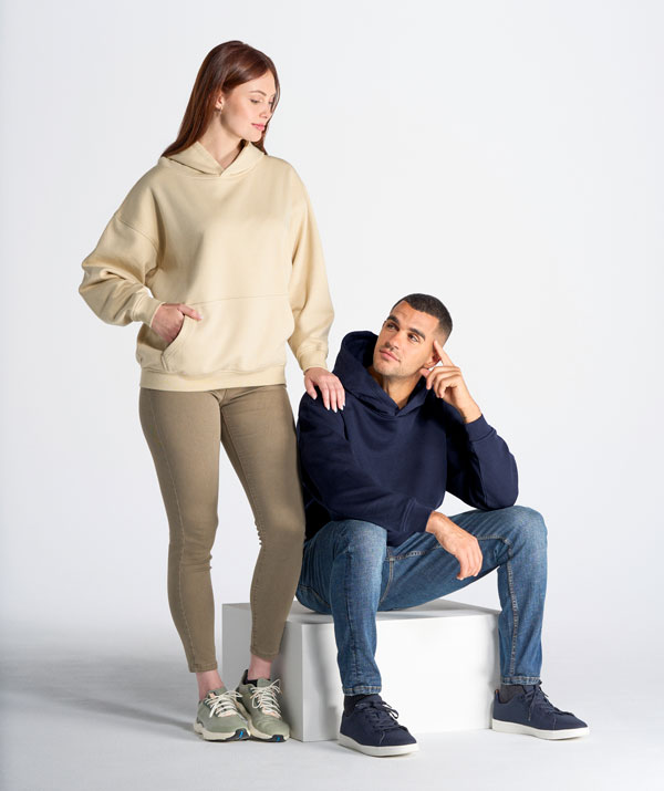 Luźny krój oversize nadaje bluzie swobodny charakter i modny, streetwearowy wygląd. Model posiada kołnierz typu crossover oraz naszytą kieszeń typu kangur, która dodaje praktyczności i stylu. Elastyczne ściągacze 2x1 przy rękawach i u dołu bluzy gwarantują wygodne dopasowanie, a łatwo usuwalna metka ułatwia personalizację – idealne rozwiązanie dla firm i marek odzieżowych.